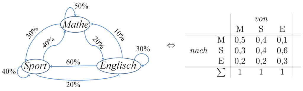 - $m_{23}$ – von Englisch zu Sport: Schüler, die Englisch als Lieblingsfach gewählt hat, werden in der nächsten Woche mit einer 20-prozentigen Wahrscheinlichkeit Sport als Lieblingsfach wählen.